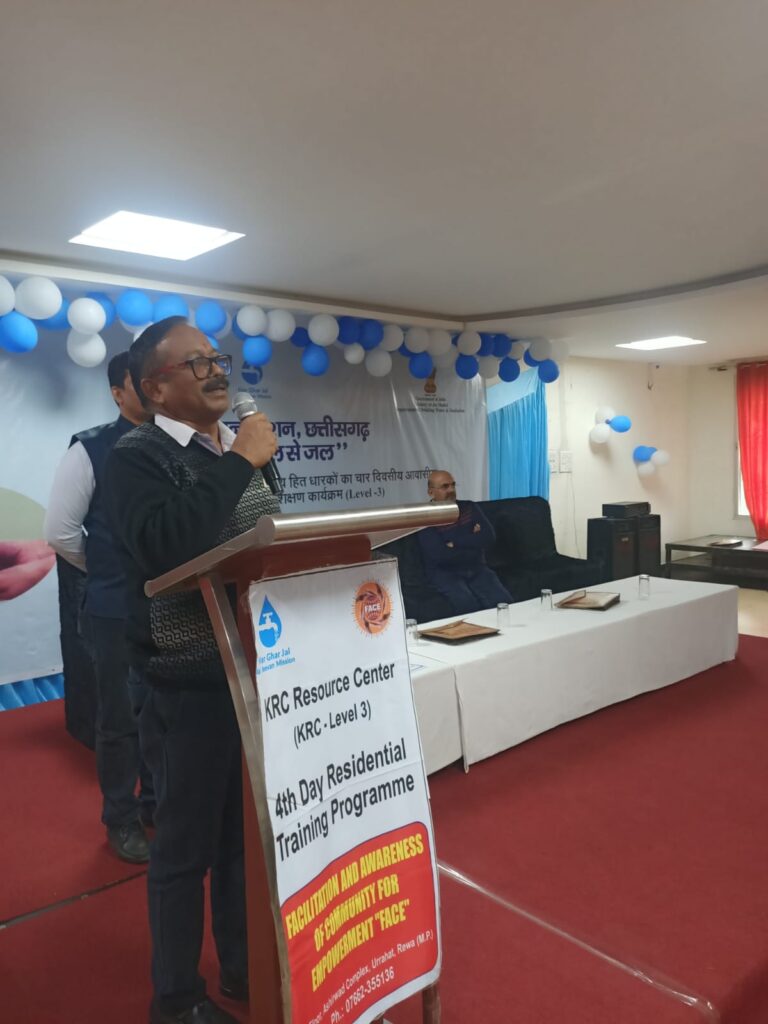 समापन समारोह के अवसर पर मुख्य अतिथि की आसंदी से बोलते हुए अपने उद्बोधन में लोक स्वास्थ्य अभियांत्रिकी विभाग के कार्यपालन अधिकारी सीबी सिंह ने कहा सही जानकारी ही नजरिए में बदलाव लाती है प्रशिक्षण का उद्देश्य आपके ज्ञान में वृद्धि करना है । आपकी कार्यक्षमता का विकास करना है । नजरिए में बदलाव लाना और उसको अपनी आदत में लेकर आना जरूरी है । जिस विषय में आपको जानकारी का अभाव था । हमने बेहतर तरीके से क्रमबद्ध रूप से आपको जल जीवन मिशन के अंतर्गत केआरसी-3 स्तर का प्रशिक्षण दिया है ।