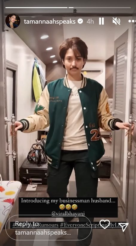 दरअसल अपनी शादी की खबरें सुनकर एक्ट्रेस इतनी अधिक परेशान हो गई कि उन्होंने खुद सोशल मीडिया पर अपने पति का चेहरा दिखा दिया है. ऐसी खबरें है कि तमन्ना भाटिया बहुत जल्द मुंबई बेस्ड एक बिजनेसमैन से शादी करने वाली हैं. इसपर एक्ट्रेस ने अपने इंस्टाग्राम स्टोरी पर एक वीडियो पोस्ट किया है. इसमें उन्होंने अपने होने वाले पति से सबको मिलवाया है. वीडियो में वो खुद एक आदमी के गेटअप में दिख रही है. उन्होंने इसके कैप्शन में लिखा, ‘ये है मेरा बिजनेसमैन पति.’ साथ ही उन्होंने हैशटैग शादी की अफवाह और सभी मेरी लाइफ की स्क्रिप्ट लिख रहे है का इस्तेमाल किया है.