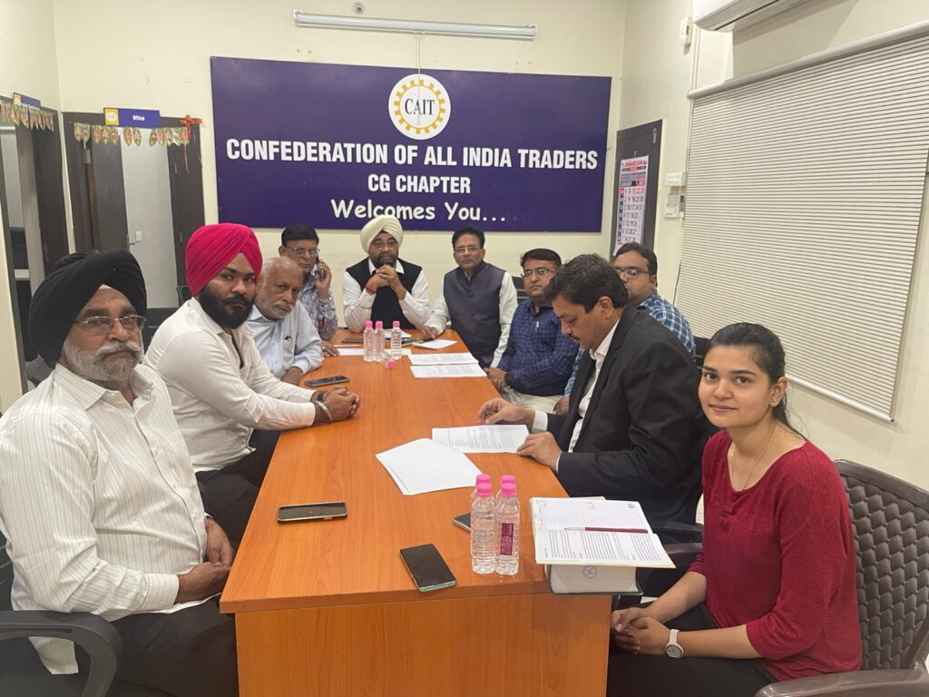 कन्फेडरेशन ऑफ ऑल इंडिया ट्रेडर्स (कैट) के वरिष्ठ राष्ट्रीय उपाध्यक्ष अमर पारवानी, चेयरमेन मगेलाल मालू, अमर गिदवानी, प्रदेश अध्यक्ष जितेन्द्र दोशी, कार्यकारी अध्यक्ष विक्रम सिंहदेव, परमानन्द जैन, वाशु माखीजा, महामंत्री सुरिन्द्रर सिंह, कार्यकारी महामंत्री भरत जैन, कोषाध्यक्ष अजय अग्रवाल एवं मीड़िया प्रभारी संजय चौंबे ने बताया कि कैट सी.जी. चैप्टर के कानूनी और तकनीकी टीम की बैठक कैट के प्रदेश कार्यालय में हुई। बैठक में कैट के प्रदेश कार्यकारी अध्यक्ष श्री परमानन्द जैन, प्रदेश महामंत्री श्री सुरिन्द्रर सिंह, प्रदेश कार्यकारी महामंत्री श्री भरत जैन, श्री महेश खिलोसिया, श्री प्रीतपाल सिंह बग्गा, श्री अवनीत सिंह, श्री प्रहलाद केशरवानी, जीएसटी विशेषज्ञ श्री सतीश तावनिया, आयकर विशेषज्ञ श्री अविनाश अग्रवाल, सीए श्री कमलेश ओझा एवं सीए किर्ती केशरवानी उपस्थित थे। बैठक मे जीएसटी एवं आयकर के अंतर्गत व्यापारियों को आ रही विभिन्न समस्याओं पर विस्तृत चर्चा की गई।
