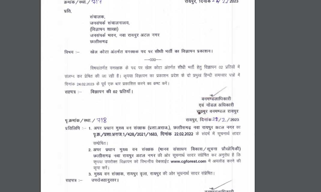 रायपुर, 27फरवरी 2023/ छत्तीसगढ़ राज्य वन विभाग के अंतर्गत विभिन्न वनमंडलों में खिलाड़ी कोटे के अंतर्गत वनरक्षक के रिक्त पदों पर सीधी भर्ती से नियुक्ति राष्ट्रीय स्तर के खेलों में प्रावीण्यता प्राप्त उम्मीदवारों से किया जाना है। इच्छुक उम्मीदवारों से 05 मार्च 2023 शाम 05.00 बजे तक आवेदन पत्र आमंत्रित किए गए हैं। आवेदन पत्र निर्धारित प्रारूप में वनमण्डलाधिकारी एवं नोडल अधिकारी रायपुर वनमंडल, रायपुर के पते पर पंजीकृत डाक (पावती सहित), स्पीड पोस्ट से ही भेजे जा सकते हैं। रिक्त पद पर निर्धारित अर्हता तथा अन्य संबंधित जानकारी वन विभाग की वेबसाइट www.cgforest.com  से download  किया जा सकता है।