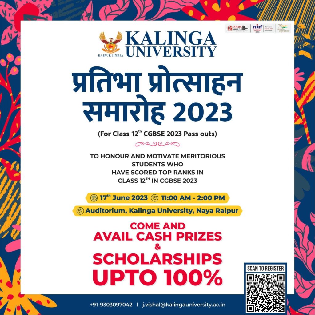 कलिंगा विश्वविद्यालय पिछले 10 वर्षों से छात्र समुदाय की सेवा कर रहा है और हमेशा अपने छात्रों की कड़ी मेहनत और सफलता को पहचानने और प्रेरित करने के लिए प्रतिबद्ध है। इस परंपरा को जीवित रखते हुए, कलिंगा विश्वविद्यालय, रायपुर 17 जून 2023 को 11:00 पूर्वाह्न बजे सम्मान समारोह, “प्रतिभा प्रोत्साहन समारोह 2023” आयोजित कर रहा है। उन मेधावी छात्रों को प्रेरित करने जिन्होंने कक्षा 12वीं में शीर्ष 10 में स्थान प्राप्त किये तथा सीजीबीएसई 2023 परीक्षाओं में 90% से अधिक अंक प्राप्त किए।