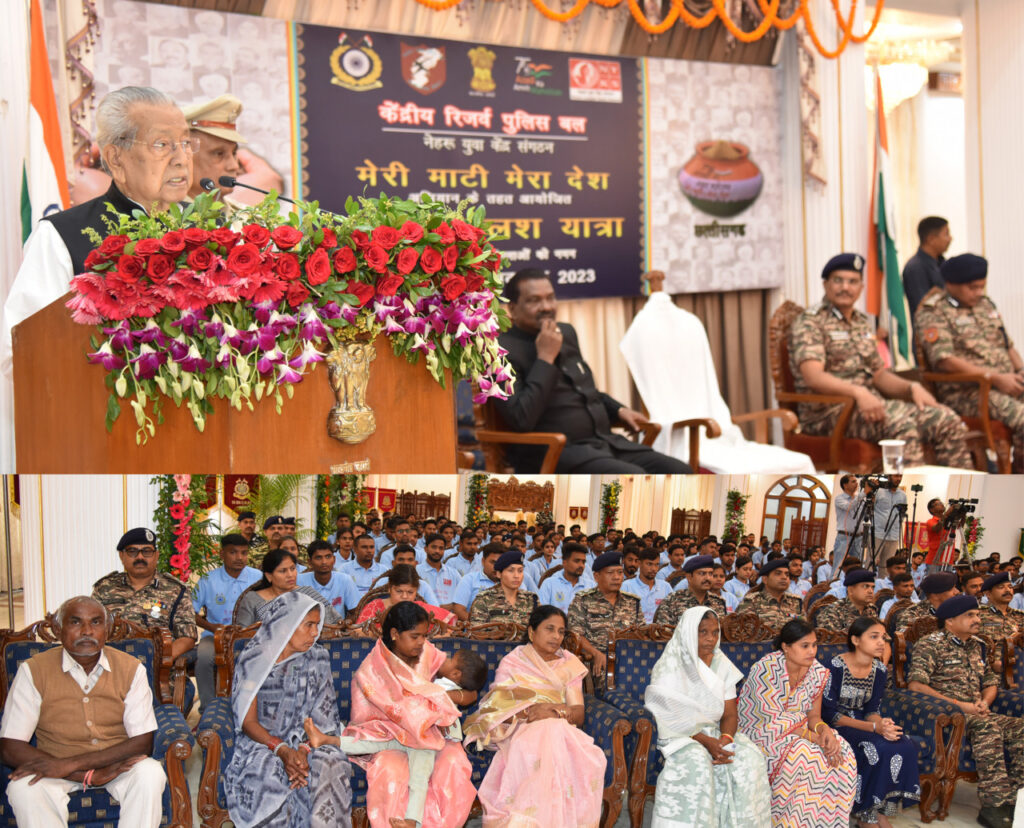 रायपुर, 27 अक्टूबर 2023/राज्यपाल श्री विश्वभूषण हरिचंदन के मुख्य आतिथ्य में आज ‘‘मेरी माटी मेरा देश‘‘ अभियान के तहत राज्य स्तर पर अमृत कलश यात्रा कार्यक्रम आयोजित किया गया इस यात्रा में पूरे प्रदेश के 146 विकासखंडों के हर कस्बे, गांव, हर घर से शहीदों के सम्मान में मिट्टी और चावल एकत्र किया गया छत्तीसगढ़ की पावन मिट्टी से भरे इन अमृत कलशों को नेहरू युवा केंद्र के युवा 30 अक्टूबर को नई दिल्ली ले जाएंेगे। जिन्हें राजधानी के कर्त्तव्य पथ पर अमृत वाटिका निर्माण के लिए उपयोग किया जाएगा। उल्लेखनीय है कि आजादी के 75वें वर्ष पर अपने स्वतंत्रता सेनानियों और स्वतंत्रता संग्राम के गुमनाम नायकों की याद में पूरे  देश में आजादी का अमृत महोत्सव मनाया जा रहा है। 12 मार्च 2021 से शुरू हुआ यह कार्यक्रम 31 अक्टूबर 2023 को समाप्त होगा। मेरा माटी मेरा देश कलश यात्रा इस कार्यक्रम का हिस्सा है।  इस गरिमापूर्ण कार्यक्रम को संबोधित करते हुए राज्यपाल श्री हरिचंदन ने कहा कि मेरा माटी मेरा देश अभियान का सूत्र  वाक्य ‘‘मिट्टी को नमन – वीरों का वंदन‘‘ छत्तीसगढ़ के लिए विशेष है जिसमें हमारे युवा राष्ट्र निर्माण की गतिविधियों में सक्रिय भाग ले रहे हैं। छत्तीसगढ़ के युवाओं ने मातृ भूमि को दुश्मनों से बचाने का रास्ता चुना है और अधिक से अधिक संख्या में सी.आर.पी.एफ, भारतीय सेना और अन्य सशस्त्र सेना में शामिल हुए है। श्री हरिचंदन ने कहा कि ‘‘मेरा माटी मेरा देश‘‘ अभियान में देश के ग्रामीण और शहरी क्षेत्रों में स्थानीय वीर शहीदों के नाम पर 2 लाख से अधिक स्मारक पट्टिकाएं बनाई गयी हैं, 2 करोड़ से अधिक पौधे लगाए गये है और पर्यावरण में सुधार के लिए पूरे देश में 2 लाख से अधिक अमृत वाटिकाएं बनाई गयी हैं। उन्होंने अभियान के तहत की  गई अदभुत पहल के लिए केंद्रीय रिजर्व बल और नेहरू युवा केंद्र के टीमों की सराहना की। जिन्होंने इस कार्य के द्वारा युवाओं को राष्ट्र निर्माण की गतिविधियों में भाग लेने के लिए प्रेरित किया साथ ही सामुदायिक विकास गतिविधियों को भी बढ़ावा दिया है।