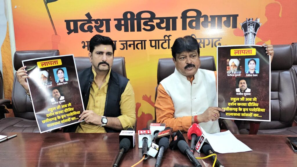 संजय श्रीवास्तव ने कांग्रेस द्वारा छत्तीसगढ़ कोटे से  राज्यसभा भेजे गए  सांसदों  के बारे में कहा की वो कहा लापता है।राहुल गांधी उन्हे छत्तीसगढ़ टूर पर ही ले आते कम से कम जनता अपने राज्यसभा सांसदों के चेहरे तो देख लेती ।संजय श्रीवास्तव ने कहा भूपेश बघेल और कांग्रेस सरकार ने छत्तीसगढ़ के लोगो का हक मारा है छत्तीसगढ़ के बाहर के लोगो को राज्यसभा भेजना पूरे छत्तीसगढ़ का अपमान है और जनता अपना हक मारने वालो को सबक सिखाने जा रही है।राहुल गांधी बताए उनके ये छत्तीसगढ़ के सांसद कहा लापता है। इसी दौरान प्रदेशनप्रवक्ता संजय श्रीवास्तव और प्रदेश मीडिया प्रभारी अमित चिमनानी ने लापता राज्यसभा सांसदों का पोस्टर जारी करते हुए पूछा ये सांसद कहा लापता है।