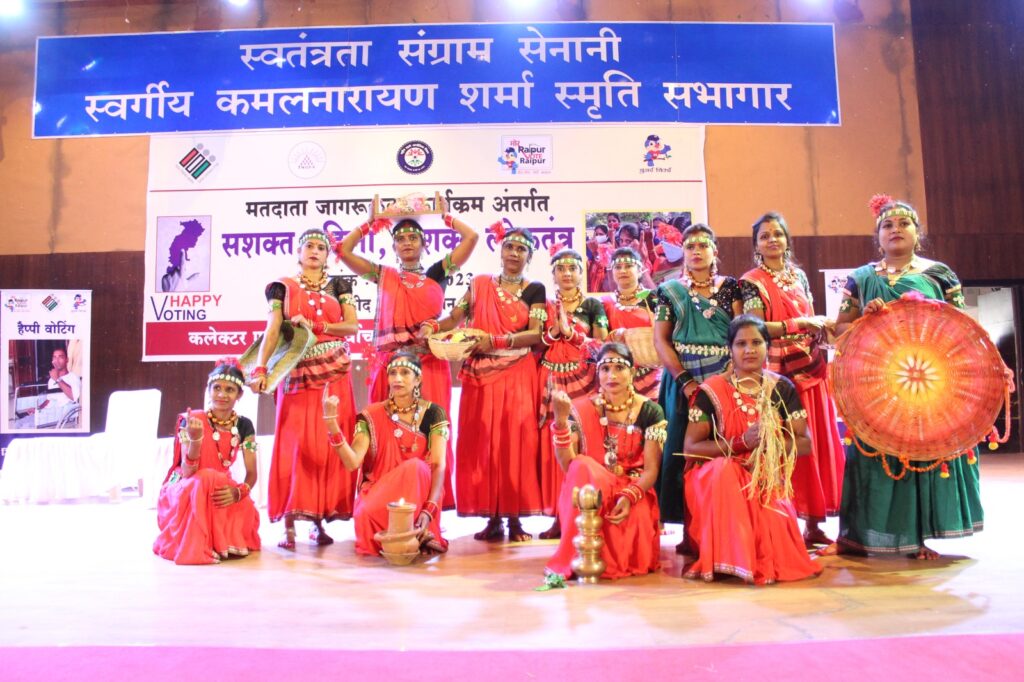 रायपुर 06 नवम्बर 2023/मतदाता जागरूकता कार्यक्रम अंतर्गत सशक्त महिला सशक्त लोकतंत्र का आयोजन शहीद स्मारक भवन में महिलाओं द्वारा किया गया। प्रेक्षक अमृता जोथी तथा श्रीमती आर विमला जी  प्रेक्षक इस अवसर पर उपस्थित थी। उन्होंने उपथित महिलाओं का उत्साह बढ़ाया। साथ ही सशक्त महिला, सशक्त लोकतंत्र थीम पर रंगोली, मेहंदी, छत्तीसगढ़ी पारंपरिक रैंप वॉक, सुआ नृत्य, कविता पाठ, सेल्फी, रील्स इत्यादि का आयोजन किया गया। वहा उपस्थित महिलाओं ने आम लोगों से मतदान करने की अपील की।