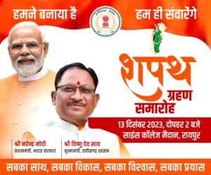 जांजगीर चांपा, 12 दिसंबर 2023/प्रधानमंत्री श्री नरेन्द्र मोदी की गरिमामय उपस्थिति में छत्तीसगढ़ के नए मुख्यमंत्री श्री विष्णु देव साय...