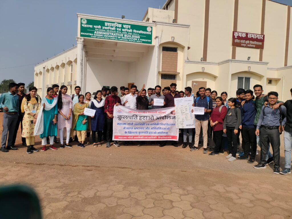 अभाविप के कृषि आयाम कार्य संयोजक श्री निखिल तिवारी ने कहामहात्मा गाँधी उद्यानिकी एवं वानिकी विश्वविद्यालय द्वारा सहायक प्राध्यापक के 36 पदों की भर्ती प्रक्रिया की में भारी अनियमितता की गयी है। सहायक प्राध्यापक के पदों लिए बनाये गया स्कोर कार्ड में भारी गड़बड़ी सामने आयी है। विश्वविद्यालय अनुदान आयोग की गाइड लाइन के अनुसार पीएचडी एवं नेट की परीक्षा के लिए पृथक-पृथक अंक देना था, जो कि नहीं किया गया था। इस कारण बड़ी संख्या में पीएचडी उम्मीदवार उपलब्ध होते हुए भी गैर पीएचडी धारी अभ्यर्थियों का चयन एवं नियुक्ति की गई। सहायक प्राध्यापक की चयन समिति के गठन में भी दोषपूर्ण प्रक्रिया अपनाई गई। विवि की चयन समिति में कुलसचिव द्वारा साक्षात्कार के अंक दिए गए थे, परंतु कुछ अभ्यर्थियों के चयन में कुलसचिव को अंक देने से रोक दिया गया था। साथ में सहायक प्राध्यापक की नियुक्तियों को अनुमोदन देने वाले प्रबंध मंडल का गठन भी त्रुटिपूर्ण किया गया था। नामांकित व्यक्ति एवं विशेषज्ञ विश्वविद्यालय अधिनियम के अनुरूप नहीं थे। इससे छत्तीसगढ़ प्रदेश के पात्र एवं पीएचडी उपाधि प्राप्त अभ्यर्थियों को साक्षात्कार में कम अंक देकर अन्य प्रदेश के उम्मीदवारों की नियुक्ति की गई थी।अभाविप ने कहा की उद्यानिकी विवि के भ्रष्ट कुलपति को बर्खास्त किया जाए। साथ में यूनिवर्सिटी के मुखिया सहायक प्राध्यापक के अभ्यर्थियों को बैक डेट पर ज्वाइनिंग करवाने का प्रयास कर रहे है, जिसकी जांच की जाए। अभाविप ने राज्यपाल को ज्ञापन सौपा था। जिस पर तीन सदस्यीय जांच कमिटी का गठन किया गया है। विवि के कुलपति को बर्खास्त नहीं किया गया तो अभाविप चरणबद्ध आंदोलन करने के लिए बाध्य होगी।विश्वविद्यालय प्रशासन शैक्षणिक व्यवस्था का निर्वहन करने में पुर्णतः असफल रही है। बीएससी उद्यानिकी के अंतिम वर्ष के विद्यार्थियों की तृतीय वर्ष के परीक्षा परिणाम अभाविप के प्रदर्शन के बाद जारी किये गए। इतनी देरी से परीक्षा परिणाम जारी करने के वजह से चतुर्थ वर्ष के विद्यार्थियों का पुनर्मूल्यांकन का परिणाम अब तक जारी नहीं हुआ है, इस कारण विश्वविद्यालय के हजारो छात्रों का भविष्य अधर में लटक गया है। शिक्षा की गुणवत्ता भी निरंतर गिरते जा रही है।अतिथि शिक्षक की भर्ती सूची में भी कुलपति द्वारा भारी गड़बड़ी की गयी है। ऐसे अभ्यर्थी जिसकी सिर्फ एमएससी हुई है उन्हें पीएचडी दिखाया गया है। और पीएचडी के अभ्यर्थियों का चयन नहीं किया गया है