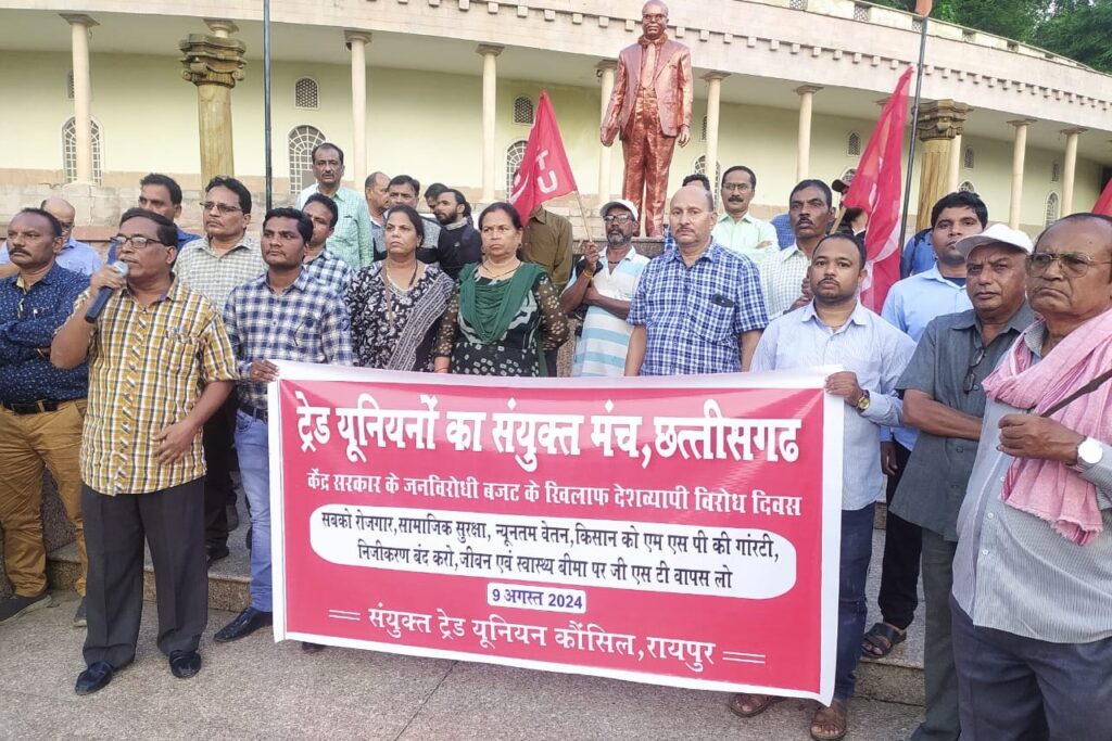 रायपुर। ट्रेड यूनियनों के संयुक्त मंच द्वारा मोदी सरकार के बजट को जन विरोधी व संकुचनकारी निरूपित करते हुए  9 अगस्त को देश भर में विरोध कार्यवाहियां आयोजित की गई । राजधानी रायपुर के अंबेडकर चौक में संध्या सेंटर ऑफ इंडियन ट्रेड यूनियंस, संयुक्त ट्रेड यूनियन कौंसिल, सेंट्रल ज़ोन इंश्योरेंस एम्पलाईज् एसोसिएशन, रायपुर डिवीजन इंश्योरेंस एम्पलाईज यूनियन, सेल्स प्रमोशन रिप्रेजेंटेटिव यूनियन, पोस्टल यूनियन,बी एस एन एल एम्पलाईज यूनियन से जुड़े सदस्यों ने जोरदार विरोध प्रदर्शन किया।