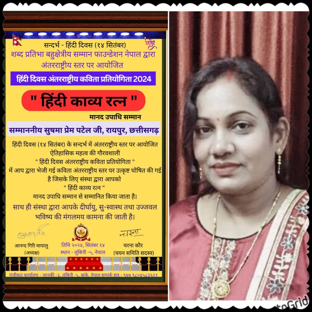 नेपाल के लुंबिनी में आयोजित किए गए एक अंतर्राष्ट्रीय स्तर के कार्यक्रम में कवयित्री सुषमा प्रेम पटेल जी रायपुर छ, ग ,को सम्मानित किया गया है। नेपाल की प्रसिद्ध संस्था शब्द प्रतिभा बहुक्षेत्रीय सम्मान फाउन्डेशन नेपाल द्वारा भाषा तथा साहित्य के क्षेत्र में उल्लेखनीय योगदान देने वाले रचनाकारों को एक ऑनलाइन प्रतियोगिता के माध्यम से आज सम्मानित किया गया है।आज हिंदी दिवस के मौके पर शब्द प्रतिभा बहुक्षेत्रीय सम्मान फाउन्डेशन नेपाल द्वारा आयोजित किए गए हिंदी दिवस अंतरराष्ट्रीय कविता प्रतियोगिता में बहुमुखी प्रतिभा के धनी आ.सुषमा प्रेम पटेल जी को ” हिंदी काव्य रत्न ” मानद उपाधि सम्मान से सम्मानित किया गया है। सुषमा प्रेम पटेल जिले के ख्याति प्राप्त कवयित्री हैं ,जिनकी अनेक रचनाएं साहित्य के क्षेत्र में गौरवान्वित हैं ।उल्लेखनीय योगदान के लिए अब तक ५०० से अधिक ऑनलाइन ऑफलाइन सम्मान मिल चुके हैं। संस्था के संस्थापक अध्यक्ष आनन्द गिरि मायालु कहते हैं – सुषमा पटेल जी की रचना जीवंत लगती है, बड़े अच्छे शब्दों का चयन किया है कविता में। ऐसे साहित्यकारों से ही असल समाज का निर्माण होता है ,जो ऐसे विशिष्ट रचनाकारों की पहचान कर राज्य की प्रोत्साहन राशि तथा सम्मान करने की आवश्यकता है।