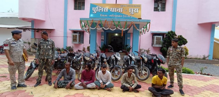 मोटरसाइकिल चोरी गिरोह का पुलिस ने भण्डाफोड करते 9 मोटरसाइकिल के साथ 5 आरोपी को पकड़ने में सफलता हासिल किया है । पुलिस से मिली जानकारी अनुसार 20 अप्रैल को टोमल लाल साहू पिता स्व. डीहू राम साहू निवासी पण्डरीपानीडीह थाना छुरा अपने हीरो स्पलेण्डर मोटरसाइकिल क्रमांक सीजी-23 एन 0665 को घर पर रखे थे को किसी अज्ञात चोर द्वारा चोरी की वारदात को अंजाम दिया गया है। प्रार्थी की रिपोर्ट पर थाना छुरा में अपराध क्रमांक 49/2025 धारा 303(2) बीएनएस कायम कर अपराध पंजीबद्व कर विवेचना में लिया गया।। विवेचना के दौरान 17 मई को घनश्याम साहू निवासी पीपरहट्टा अपने मो.सा. प्लेटिना क्रमाक 23 एच 4764 से साप्ताहिक बाजार छुरा आए था। जिसका किसी अज्ञात चोर द्वारा मोसा. प्लेटिना को चोरी कर ले गया था।