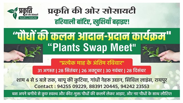 प्रकृति की ओर सोसायटी के तत्वाधान में शहर के प्रकृति गृहउद्यान प्रेमियों को जोड़ने और हरियाली को बढ़ावा देने के उद्देश्य थे। यह कार्यक्रम प्रत्येक माह के अंतिम रविवार को किया जाता है यानी रविवार 31 अगस्त समय शाम 4 बजे से 5 बजे , बापू की कुटिया,गांधी नेहरू उद्यान, सिविल लाइंस,रायपुर में आयोजित किया जा रहा है । सोसायटी के अध्यक्ष मोहन वर्ल्यानी ने कार्यक्रम में भाग लेने के लिए सभी गार्डन प्रीमियो को आमंत्रित करते हुए कहा कि बस आपको कुछ पौधों की कलम (कटिंग) अपने बगिया से लेकर आना होगा यह ध्यान दे कि आपके पौधे स्वस्थ और किट मुक्त होने चाहिए और आपअपनी पसंद के दूसरे पौधों को आपस में अदला बदली करके अपने गार्डन को और भी आकर्षण हरा-भरा बना सकते है।