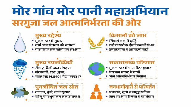 मोर गांव मोर पानी महाभियान केवल शासन की पहल नहीं, बल्कि इसे एक जन आंदोलन का स्वरूप दिया गया है। प्रत्येक ग्राम पंचायत में जनप्रतिनिधि, स्वयं सहायता समूहों, युवाओं और ग्रामीणों की भागीदारी सुनिश्चित की गई है। इन समूहों को जल संरक्षण तकनीकों, वर्षा जल संचयन विधियों, भूजल पुनर्भरण और पर्यावरणीय संतुलन के प्रति जागरूक किया गया। जिले के स्कूलों और महाविद्यालयों में भी विद्यार्थियों के बीच ‘मोर गांव मोर पानी महाभियान‘ विषय पर रैलियां, निबंध प्रतियोगिताएं और जागरूकता कार्यक्रम भी आयोजित किए गए।मोर गांव मोर पानी महा अभियान के चलते जिले में कई स्थानों पर भू-जल स्तर में 1 से 2 मीटर तक सुधार दर्ज किया गया है। पहले जिन गांवों में गर्मी के मौसम में पेयजल संकट था, वहां अब हैंडपंप और कुएं सुचारू रूप से चल रहे हैं। शासन का लक्ष्य है कि आने वाले वर्षों में जिले के प्रत्येक गांव में पर्याप्त जल संरचनाएं निर्मित हों, ताकि सरगुजा जल आत्मनिर्भर जिला के रूप में विकसित हो सके।